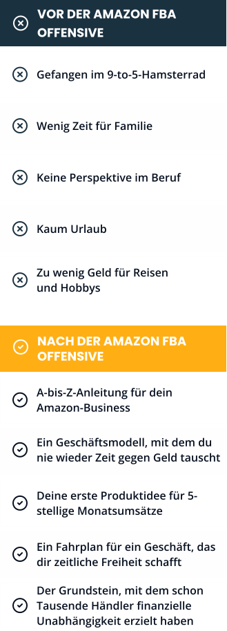 Genau deshalb gibt es die Amazon FBA Offensive. Hier teilen wir zum ersten Mal unser geballtes Wissen aus 18 Jahren Onlinehandel, mehr als 3.000 betreuten Mentoring-Teilnehmern und über 5.000 erfolgreichen Produktlaunches auf Amazon – Schritt für Schritt für deinen Erfolg.